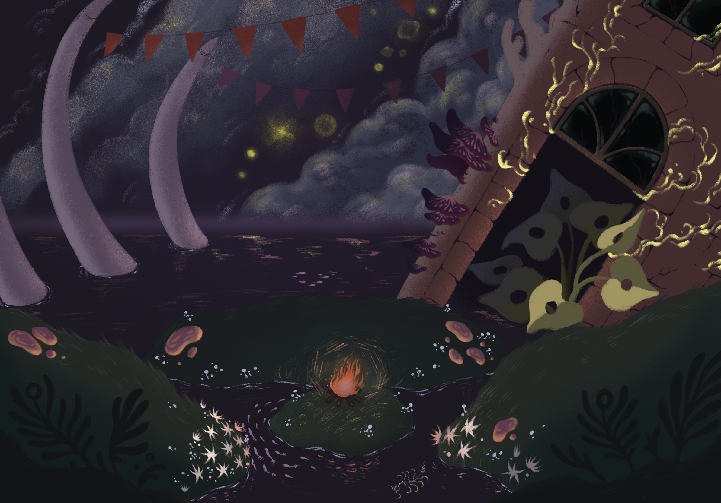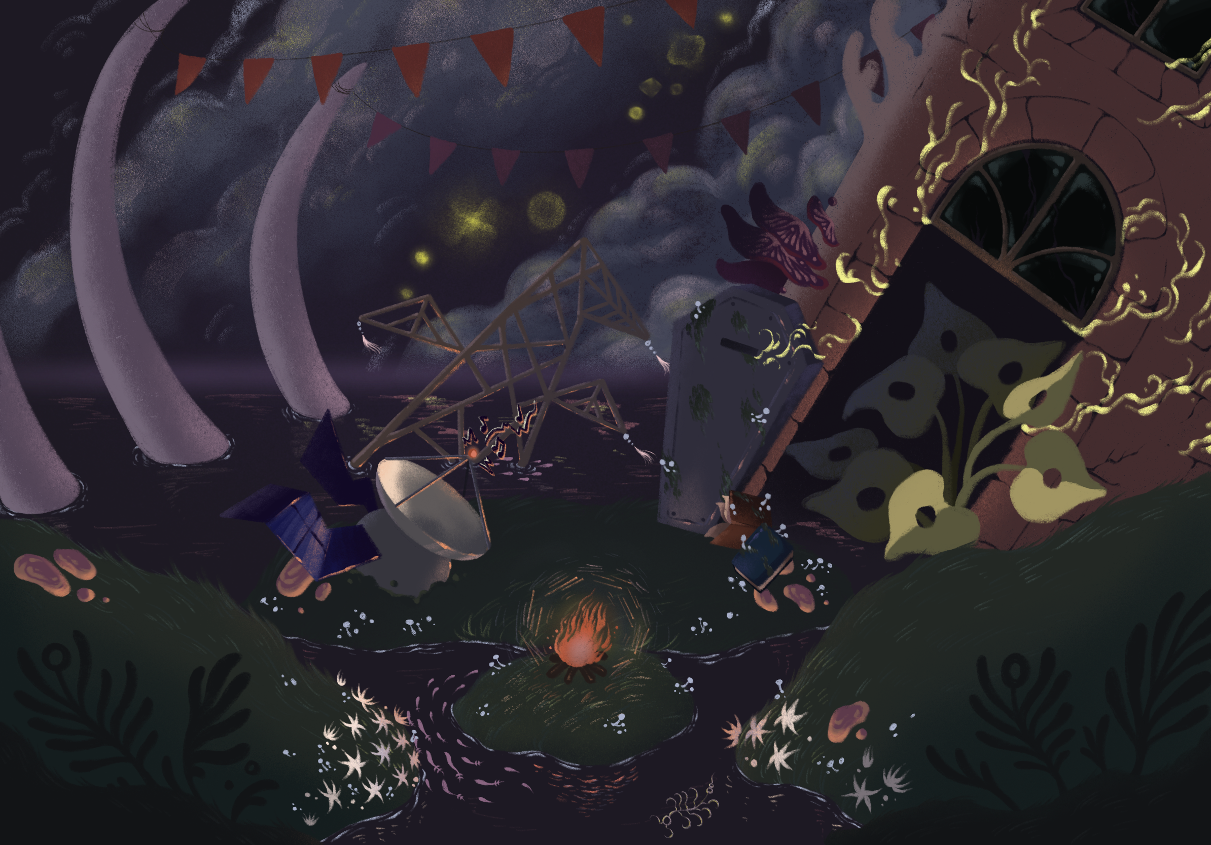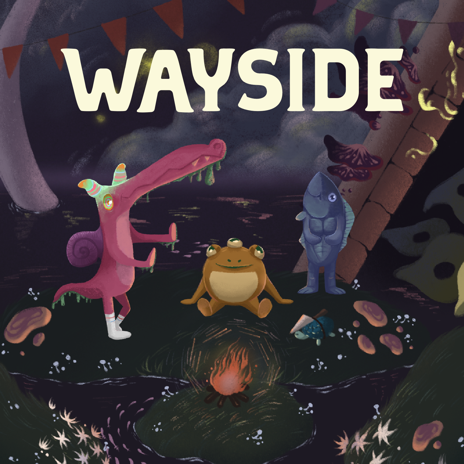 Wayside is a ~30 min interactive campfire story set in a post-apocalyptic universe filled with frogs and other slimy (but mostly friendly) creatures. It was created throughout 2023 by a team of 10 as part of the Creativity Jam, an annual creative marathon co-organized by me and Ben Schenerman. Our theme was "Radioactive x You Made It Feel Like Home".